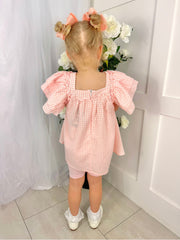 A girls beautiful gingham loose fit shirt with ruffled shoulders and matching cycling shorts set.